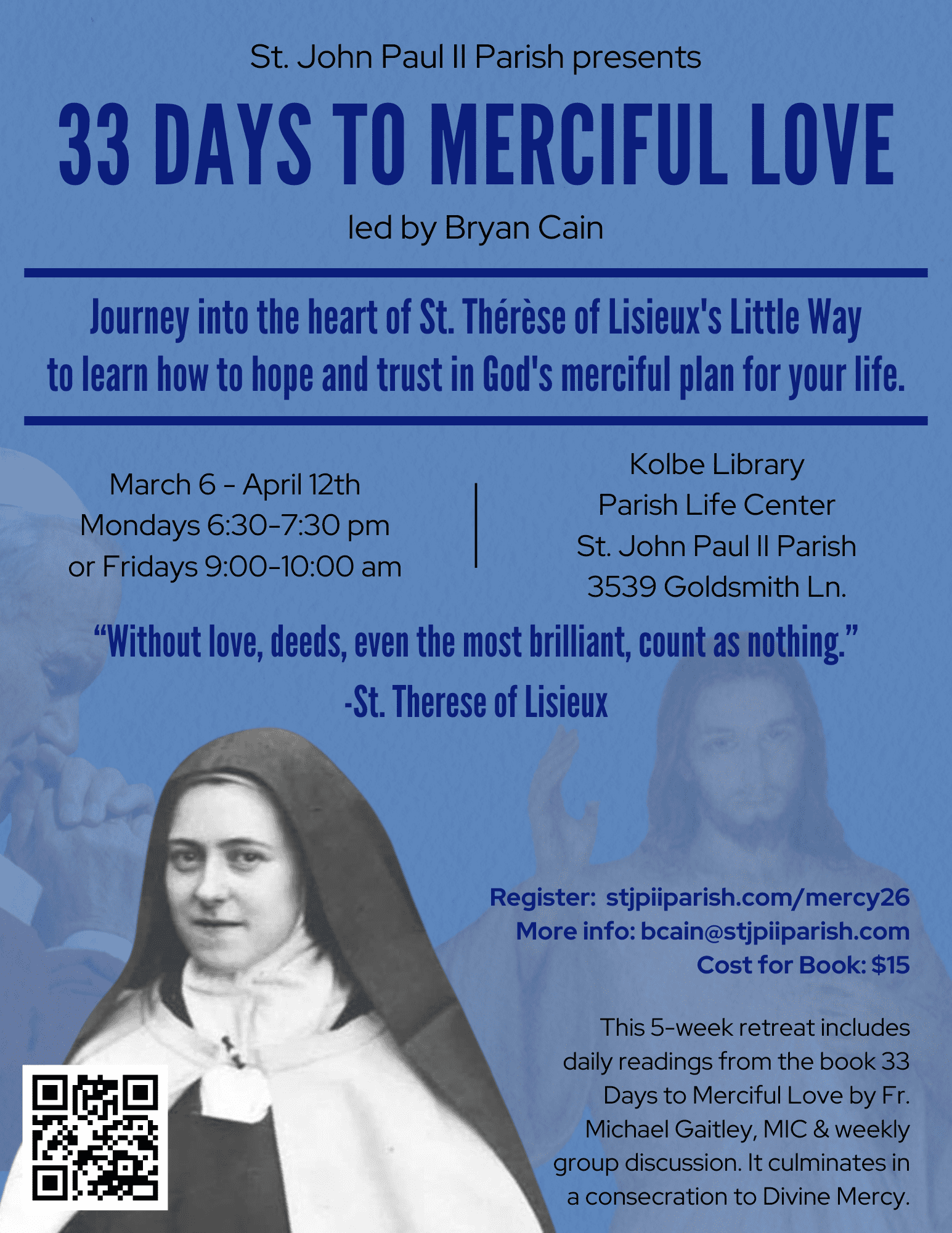 33 Days to Merciful Love @ St. JPII Parish 2026 Join us in a Consecration to Divine Mercy! We will use the book 33 Days to Merciful Love by Fr….